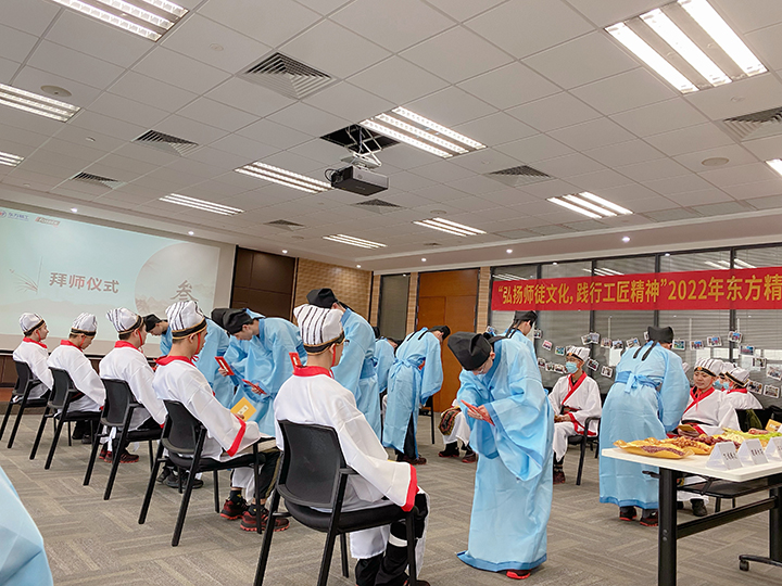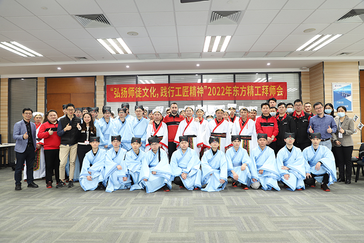 尊師重道是中國的優(yōu)良傳統(tǒng),東方精工繼承中國傳統(tǒng)美德,注重拜師禮儀?;顒?dòng)伊始,師徒們穿上古代的拜師儀式服裝:師傅們英姿颯爽,徒弟們神采奕奕,拜師現(xiàn)場展現(xiàn)出莊嚴(yán)端正的氛圍。