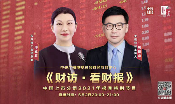 6月2日,東方精工集團(tuán)總裁邱業(yè)致女士參加了央視《財訪·看財報》直播欄目,與央視著名主持人姚振山先生及天風(fēng)證券機(jī)械行業(yè)分析師李魯靖先生共同對話。